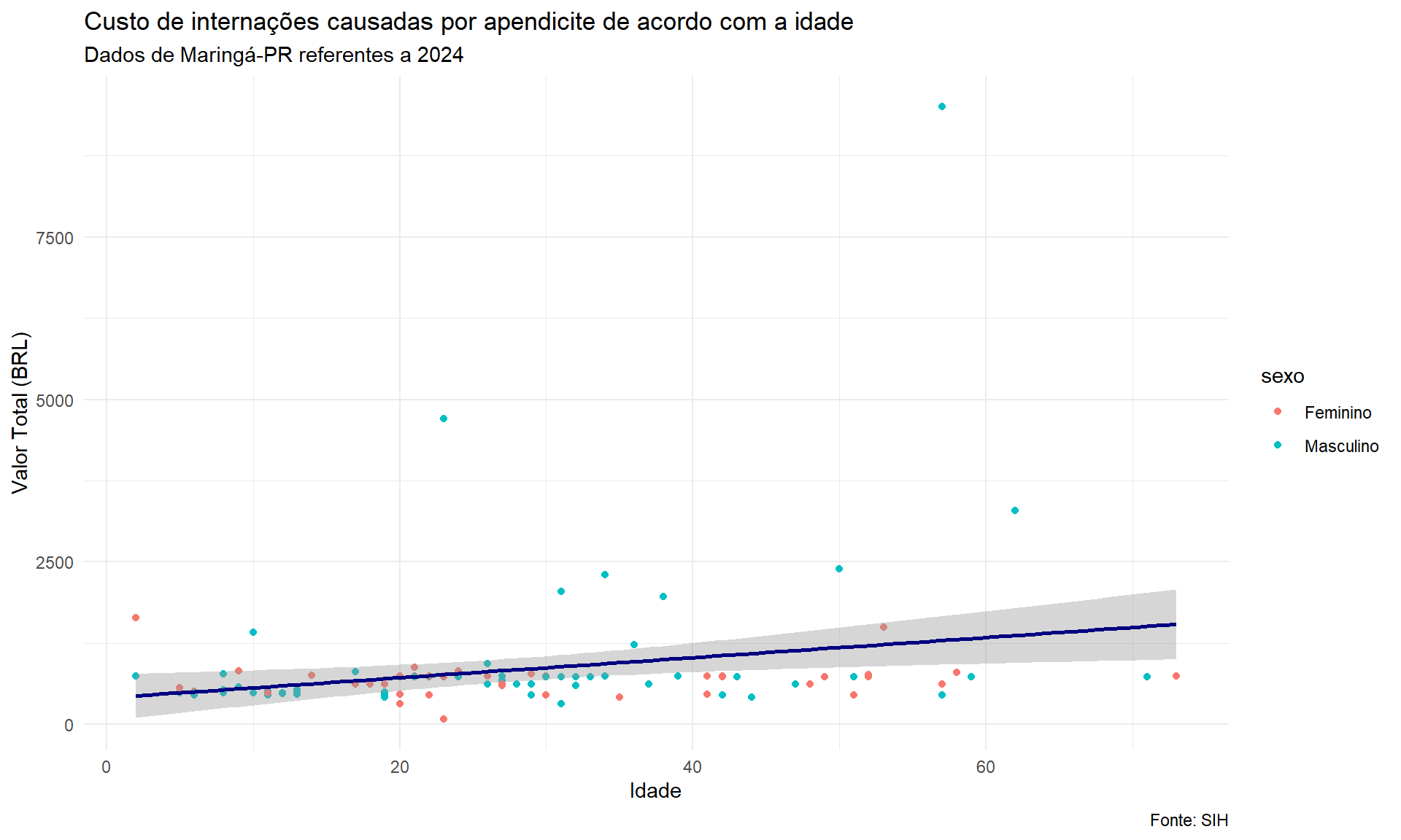 Vamos trabalhar com dados de internações por apendicite em Maringá-PR para entender como a idade influencia o custo total das internações.